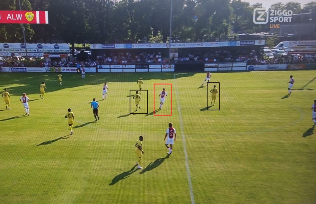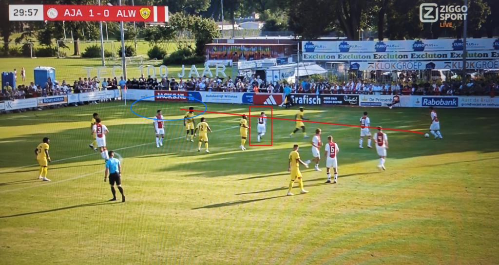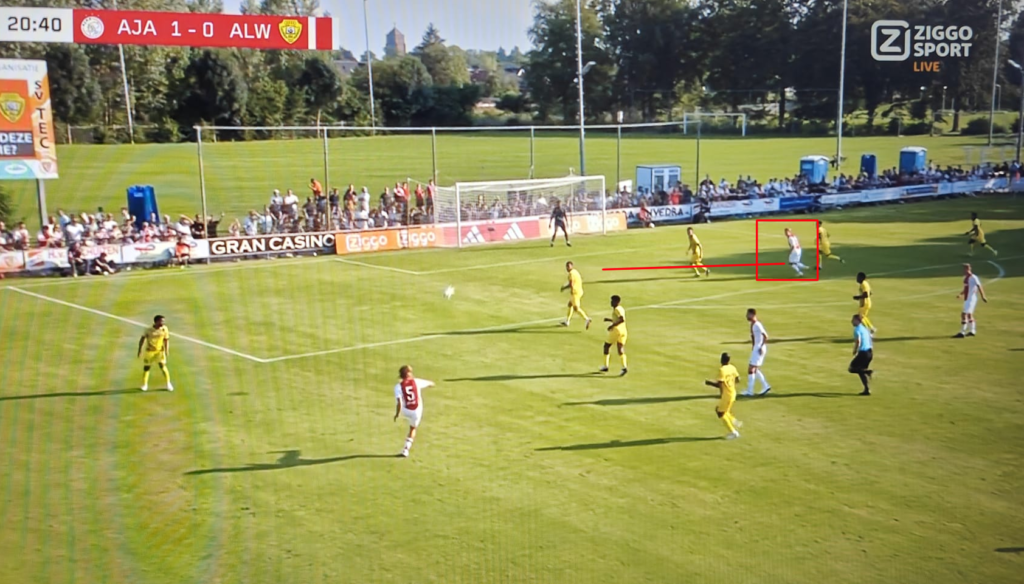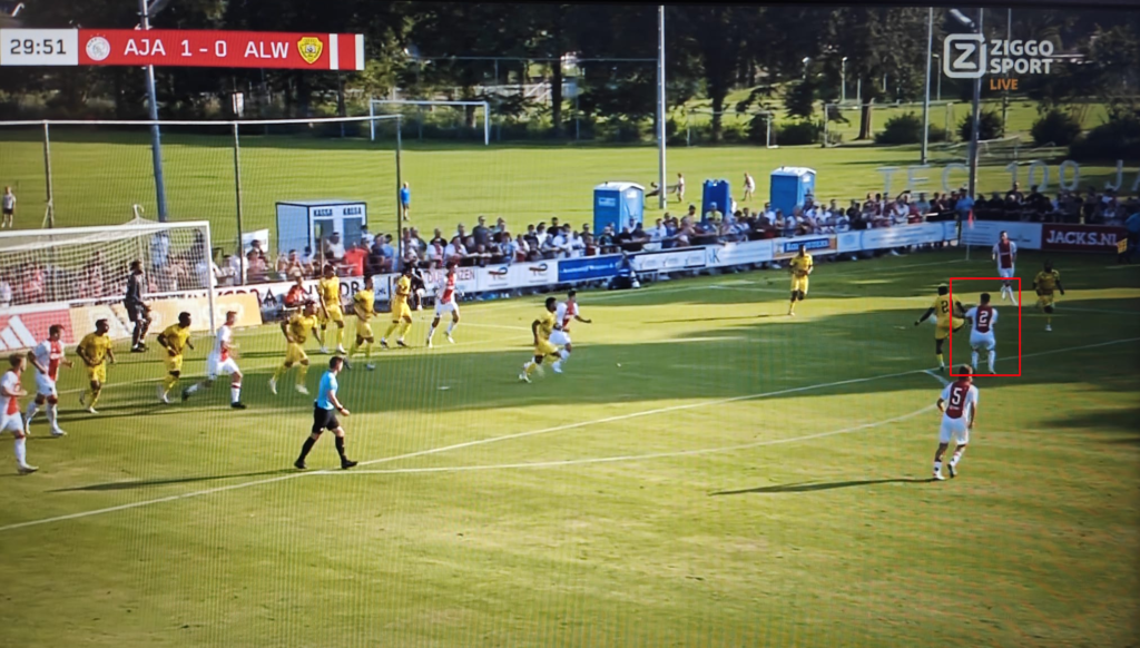 Waar Gaaei het afgelopen seizoen extreem moeilijk had bij Ajax, zie je nu soms een glimp van de kwaliteiten die hij wel heeft en waarom Mislintat hem naar Ajax wilde halen. Gaaei heeft drie voorname kwaliteiten: gevoel voor ruimte (in de diepte), zijn lage voorzet en zijn drive. Deze kwaliteiten worden mooi zichtbaar bij de 2-0 van Ajax. Het mooie is namelijk dat Gaaei de bal eerst terug verovert door fanatiek en vol energie druk te zetten na een afgeslagen corner (zie afbeelding 1).