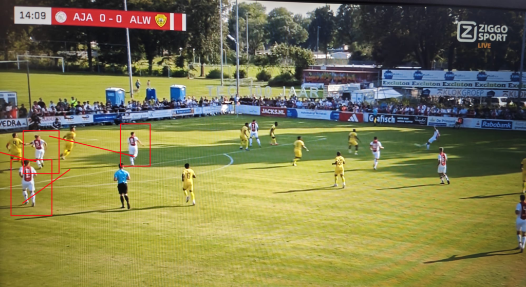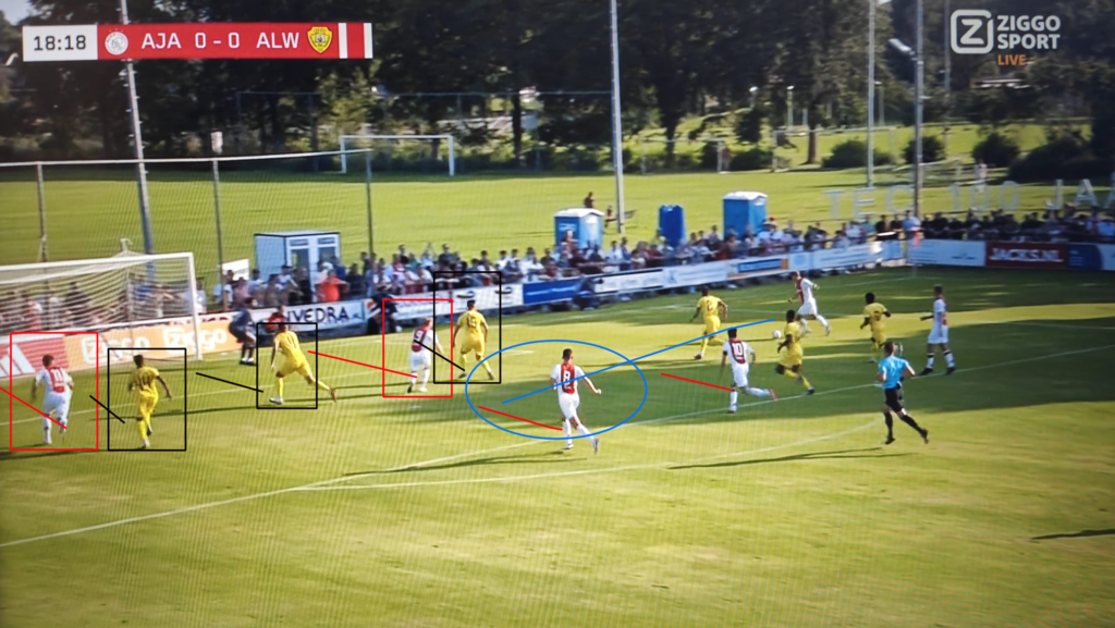Bij voorzetten van de zijkant is er een opvallend patroon te zien onder Farioli. Waar bij Van ’t Schip er vaak een gebrek aan mensen in de 16 meter was en bij Steijn de spelers vaak heel statisch stonden te wachten, is dit bij Farioli anders. Wat opvalt, is dat bij elke bal voor de goal de bezetting (min of meer) gelijk is. Er sprint altijd één speler naar de tweede paal, één speler naar de eerste paal en er staan er minimaal nog twee klaar om de 16 meter in te sprinten. Hierdoor zijn de meest belangrijke posities constant bezet. Natuurlijk kan dit alleen bij langdurig balbezit en als er genoeg spelers in de buurt van de goal zijn, maar het is opvallend om te zien. Het grootste voordeel van deze bezetting is dat de spelers bij de eerste en tweede paal de tegenstanders altijd weglokken, waardoor er vaak ruimte achter ontstaat (de blauwe cirkel), in dit voorbeeld profiteert van den Boomen hiervan met de goal. In de afbeelding hieronder is dat weergegeven, de rode lijnen geven aan waar de spelers van Ajax naar toe bewegen, en de zwarte lijnen wat dit tot gevolg heeft voor de spelers van de tegenstander.