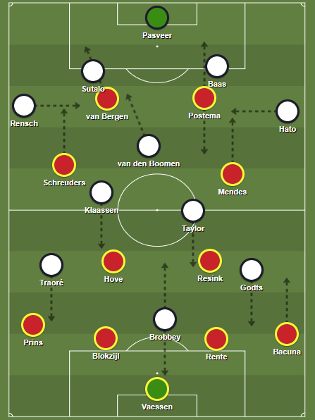De keuze van Farioli om dit op deze manier op te lossen, is waarschijnlijk gebaseerd op het feit dat hij de zijkanten wil blijven afdekken met de backs, en dat Taylor goed in staat is om de nodige meters defensief af te leggen. Daarnaast zorgt deze aanpak ervoor dat Godts niet constant achter Bacuna aan hoeft te lopen. In combinatie met het feit dat dit een simpele oplossing is, gezien de korte voorbereidingstijd, is het logisch dat Farioli voor deze strategie kiest.