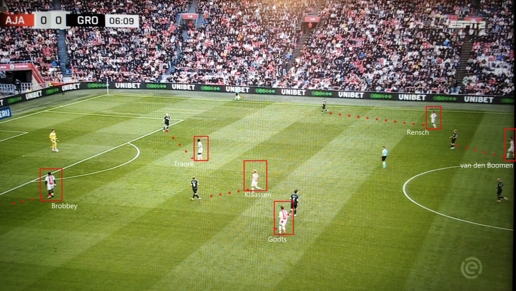 Ajax heeft een duidelijk plan bij balbezit. Het team vormt zich namelijk in een 4-2-3-1-formatie, waarbij Taylor in de eerste fase van de opbouw naast Van den Boomen komt te spelen. Klaassen moet tegelijkertijd in de rug van de twee controleurs de ruimte zien te vinden. Het is echter duidelijk dat Klaassen maar matig slaagt in deze opdracht; in sommige fases staat hij te diep, waardoor het voor de centrale verdedigers te gemakkelijk is om hem op te vangen. Tegelijkertijd is het baltempo te laag, waardoor de linies van FC Groningen gemakkelijk kunnen sluiten. Zeker tegen een tegenstander die vanuit zonedekking speelt, is het van belang om ze in keuzes te dwingen, en daarvoor is snelheid in de balcirculatie essentieel. Met name Šutalo maakt een paar keer de verkeerde keuze door de bal langzaam naar Rensch te spelen, terwijl een directe pass naar Traoré of een crosspass naar de andere kant mogelijk was. Op die manier zouden er kansen gecreëerd kunnen worden tegen deze ploeg.