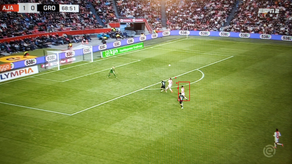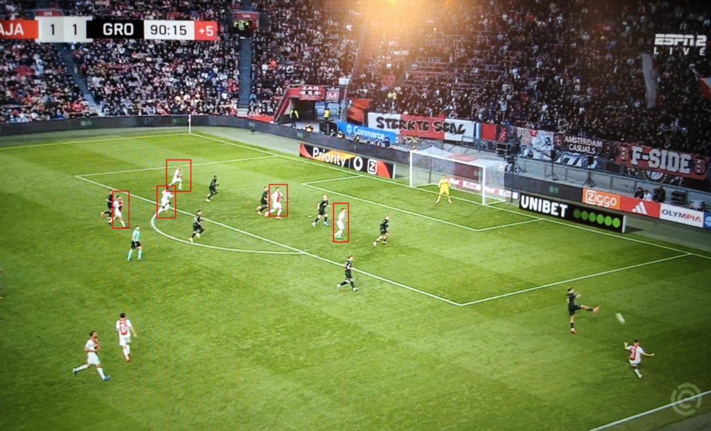 De bezetting dankzij de 3-4-2-1 is zeer goed op orde voor de goal, waardoor Ajax in de 16 bijna met gelijke aantallen staat.