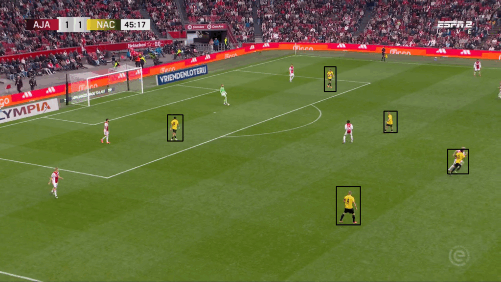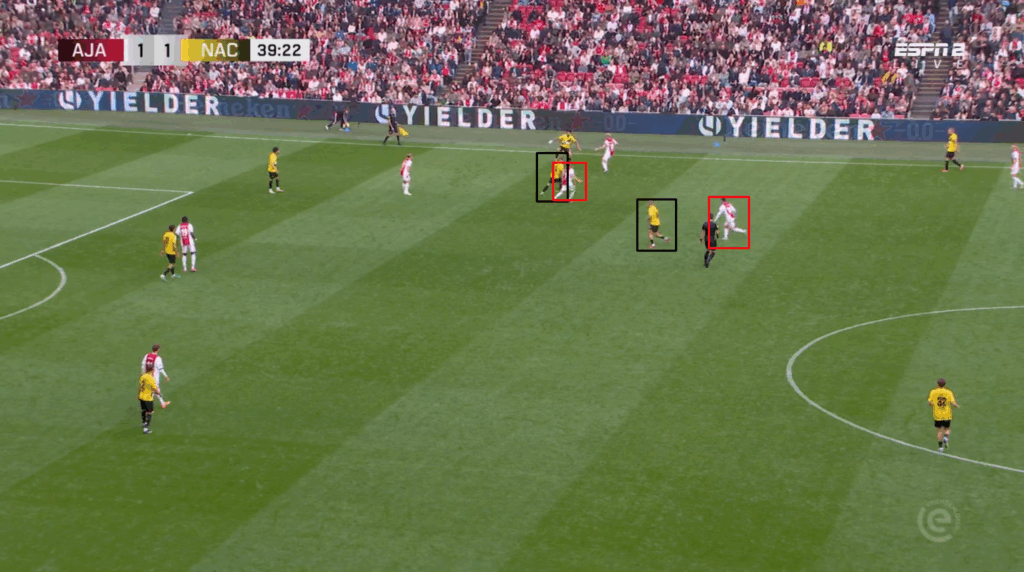 Ook in het drukzetten heeft NAC goed opgelet op eerdere wedstrijden. Ajax zet ook daar druk met behulp van mandekking, iets wat normaal gesproken geen probleem mag zijn en zelfs gebruikelijk is. Het probleem is dat de timing van het doordekken cruciaal is en de afspraken daarin extreem duidelijk moeten zijn, want een halve seconde te laat kost je een goal aan de andere kant. De sleutel van NAC is als volgt: linksbuiten Sowah heeft de ruimte gekregen om te gaan zwerven en met name de ruimte in de rug van Klaassen te bespelen. Op die manier komt Ajax in de problemen en houdt NAC een mannetje over op het middenveld, ook omdat Kemper er al in een vroeg stadium voor zorgt dat hij Gaaei aan zich bindt door hoog te gaan staan. Dit zorgt ervoor dat Ajax continu moet doordekken met één van de centrale verdedigers, en ook hier ontbreken de afspraken. Sutalo en Itakura worden onvoldoende geholpen door Taylor in de momenten van doorstappen, omdat die zich ook geregeld uit positie laat lokken en daardoor de ruimtes in het centrum gigantisch worden. Hoewel je dit kunt toeschrijven aan de centrale verdedigers, ligt het probleem dieper: er is geen duidelijkheid, waardoor die spelers op eigen initiatief moeten beslissen om wel of niet door te stappen, en dan voor de veilige oplossing kiezen.
