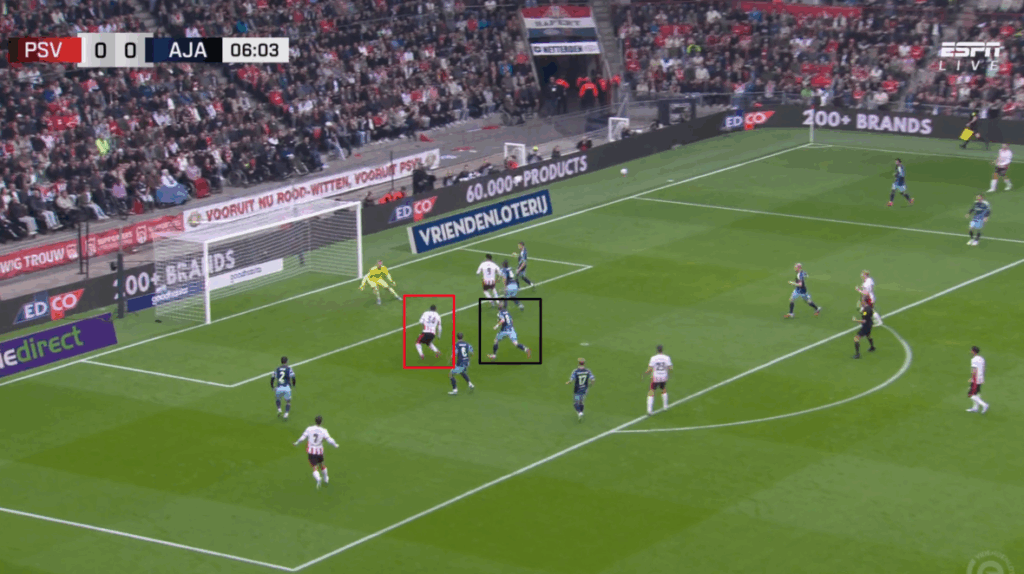 Ook defensief kent Ajax de nodige problemen, die symbool staan voor dit Ajax en die verder gaan dan deze wedstrijd. Ajax hanteert op het middenveld (in theorie) mandekking. Dit houdt in dat de middenvelders van Ajax simpelweg de middenvelders van de tegenstander moeten volgen. Dit geldt zowel in het druk zetten als lager op het veld, en zelfs in de eigen zestienmeter. Dit is niet alleen in deze wedstrijd het geval, maar al gedurende het gehele seizoen, en werd vorige week onder meer tweemaal door PSV op zeer simpele wijze uitgebuit. Hoewel bij de 1-0 van PSV vorige week er zeker blaam is voor Taylor, is dat niet de oorzaak van het probleem. Tuurlijk, Taylor mag Saibari niet uit het oog verliezen, maar hij heeft een lastige taak: hij moet namelijk zowel de bal als de tegenstander in de gaten houden. Daarbij is de vraag in hoeverre dat succesvol kan zijn. Inmiddels is al wel duidelijk dat geen enkele topploeg nog zo verdedigt, want het is je lot in handen leggen van individuele kwaliteit en reactief moeten verdedigen (je moet namelijk reageren op waar een tegenstander gaat lopen). Dit is waarom vrijwel alle topteams in dit soort situaties ervoor kiezen om de man over te geven en zonedekking te hanteren. In dat geval moet Itakura zijn man overnemen en met name de zone waar de bal in valt gewoon verdedigen. Hij kan daardoor, in plaats van te reageren op wat de tegenstander doet, gewoon de bal aanvallen. Dat is gemakkelijker voor een verdediger en bewezen effectiever.