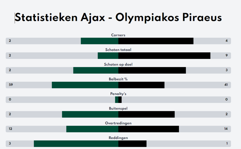 Ajax speelde een pittig oefenduel tegen de Conference League winnaar van afgelopen seizoen, en dat was ook te merken. De sterke tegenstander zette hoog druk tegen Ajax, op een manier die Ajax nog niet eerder was tegengekomen, wat wel voor wat problemen zorgde. Het was een redelijk gelijk opgaand duel, waarbij in de tweede helft Olympiakos wel een fractie sterker was. Kanttekening daarbij is dat dit voor de meeste Ajax-spelers de eerste keer was dat ze 90 minuten speelden, terwijl Olympiakos de tweede helft met een volledig nieuw elftal speelde. Fitheid zal zeker ook een rol hebben gespeeld. Uiteindelijk een keurige 1-0 overwinning, maar Farioli heeft ook wat huiswerk meegekregen aan de hand van deze wedstrijd. Dit laten de statistieken ook zien: veel balbezit voor Ajax, maar ook minder schoten.