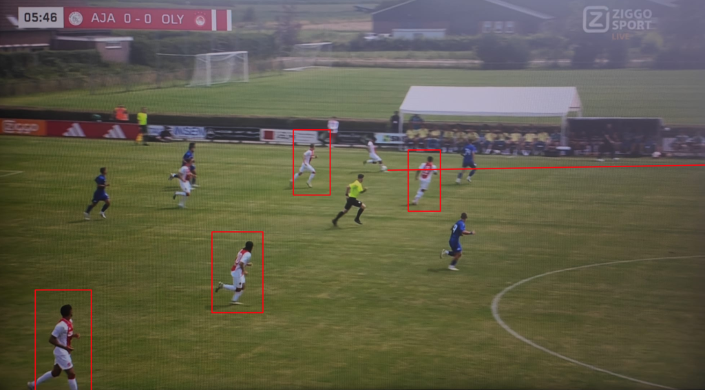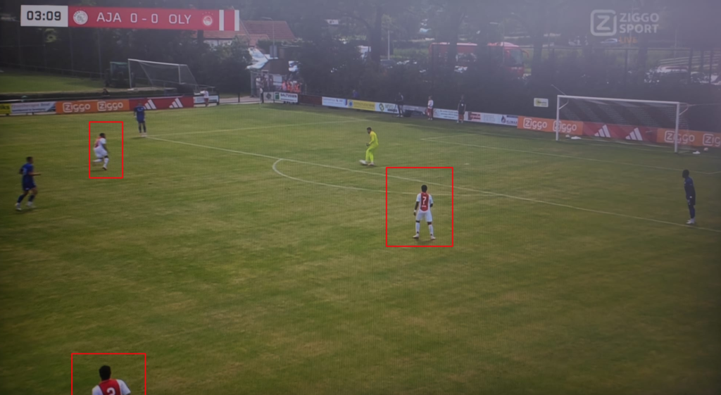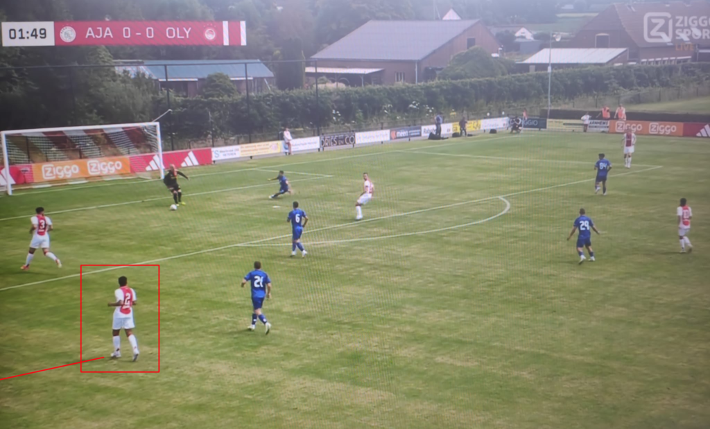 Een kleine inzage in Farioli’s pragmatisme was ook te zien bij deze wedstrijd. Waar in de voorgaande wedstrijden Forbs mocht doorstappen, was het in deze wedstrijd Banel, en daar waren twee simpele redenen voor. De linksback van Olympiakos staat verder naar voren in de opbouw en staat daardoor sneller in de buurt van Rensch. De tweede reden is dat Wijndal niet dezelfde snelheid en spelintelligentie heeft als Hato, waardoor hij minder geschikt is om agressief door te stappen. Het is goed om te zien, en om te lezen dat Farioli de tegenstanders tot op het bot analyseert en de spelers meeneemt in wat ze kunnen verwachten. Zo heeft hij ook meerdere wedstrijden van de tegenstanders in de voorbereiding bekeken om zijn elftal goed voor te bereiden. In de onderstaande afbeelding kun je zien dat inderdaad Banel doorstapt en dat Rensch in zijn rug tussen de back en de buitenspeler gaat staan.