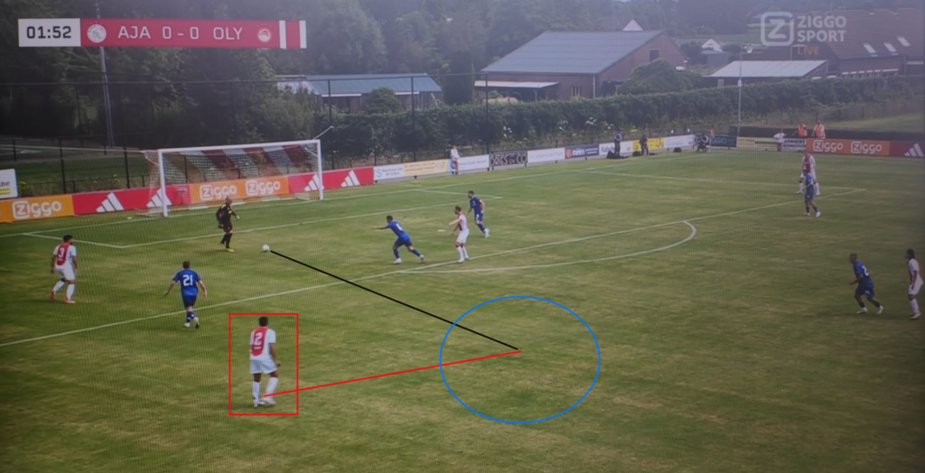 Waar Farioli ervoor kiest dat de backs veel in het middenveld komen, is dat in de eerste fase van de opbouw anders. Als de keeper de bal heeft, beginnen de backs breed tegen de zijlijn aan om het spel zo groot mogelijk te maken en wachten ze op het juiste moment om in te kunnen schuiven. Dit gebeurt meestal als een van de centrale verdedigers de bal ontvangt. Deze wisselwerking zorgde er met name in de eerste helft voor dat Ajax de felle druk van Olympiakos een aantal keer keurig kon omzeilen. In eerste instantie zie je in het voorbeeld Rensch naar buiten toe bewegen. Hierdoor trekt hij ruimte op het middenveld voor spelers om zich aan te bieden. Doordat Olympiakos agressief doorstapt vanuit de laatste lijn, was het lastig voor de middenvelders of de aanvallers om daar vrij te komen.