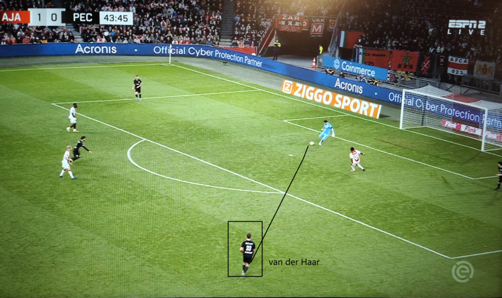 Ajax had moeite om PEC Zwolle echt goed onder druk te zetten, en dat kwam vooral door het gedurfde voetbal van de ploeg van Jansen. PEC koos ervoor om Ajax’ drukzetten te omzeilen door een ‘overload’ te creëren aan de rechterkant van Ajax. Hierdoor werd het voor Rensch lastig om zoals gebruikelijk door te dekken richting de linksback, omdat hij dan een te groot gat achterliet. Dit probleem werd versterkt doordat Sutalo niet in staat was om dit gat adequaat te dichten.