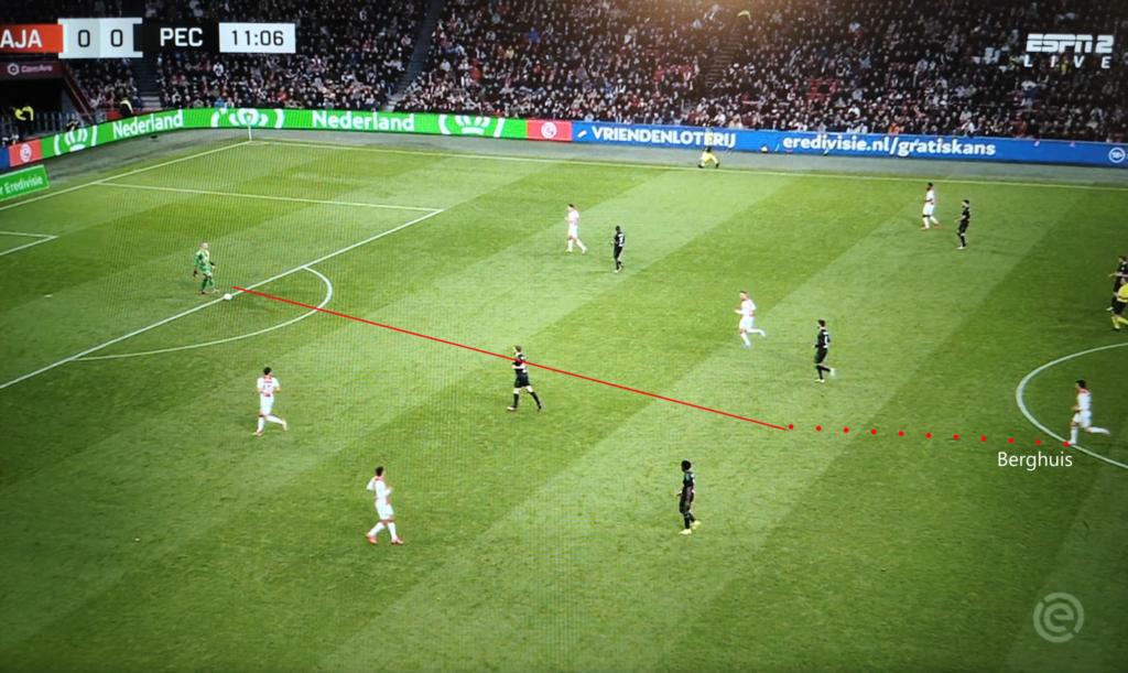Berghuis had het niet alleen verdedigend zwaar, maar ook aan de bal kende hij bij vlagen grote moeite. Waar Klaassen constant onderweg is en ruimte zoekt om in de diepte te lopen, speelt Berghuis liever met de bal aan zijn voeten. In de eerste helft worstelde hij zichtbaar om vrij te komen tussen de linies. Dit was deels te danken aan het uitstekende verdedigende spel van PEC, maar ook aan Berghuis zelf, die de momenten waarop het wél mogelijk was om vrij te komen, niet goed herkende.