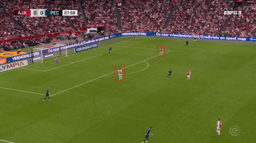 Ondanks dat PEC Zwolle in deze wedstrijd niet tot veel grote kansen kwam, gaf Ajax toch geregeld behoorlijke ruimtes weg. Wat daarin bij Ajax opvalt, is dat alles balgeoriënteerd is. Wanneer de bal aan de zijkant is, ontstaat er vaak in de halfspace aan de andere kant ruimte. Dit gebeurt met name wanneer Ajax aan de linkerkant moet verdedigen, waarbij Taylor en Regeer richting de bal bewegen en er ruimte in hun rug ontstaat. Dit heeft te maken met de individuele kwaliteit van deze spelers, maar ook met de onderlinge afstanden. Vaak staat de voorste speler meer dan 40 meter verwijderd van de laatste verdediger, ook in een laag blok. Deze afstanden zijn vaak veel te groot, waardoor een tegenstander hier gemakkelijker tussendoor kan voetballen. PEC Zwolle was vandaag niet bij machte dit te benutten, maar dit is een probleem dat ploegen als Inter Milan en PSV wel gaan afstraffen in de komende wedstrijden.