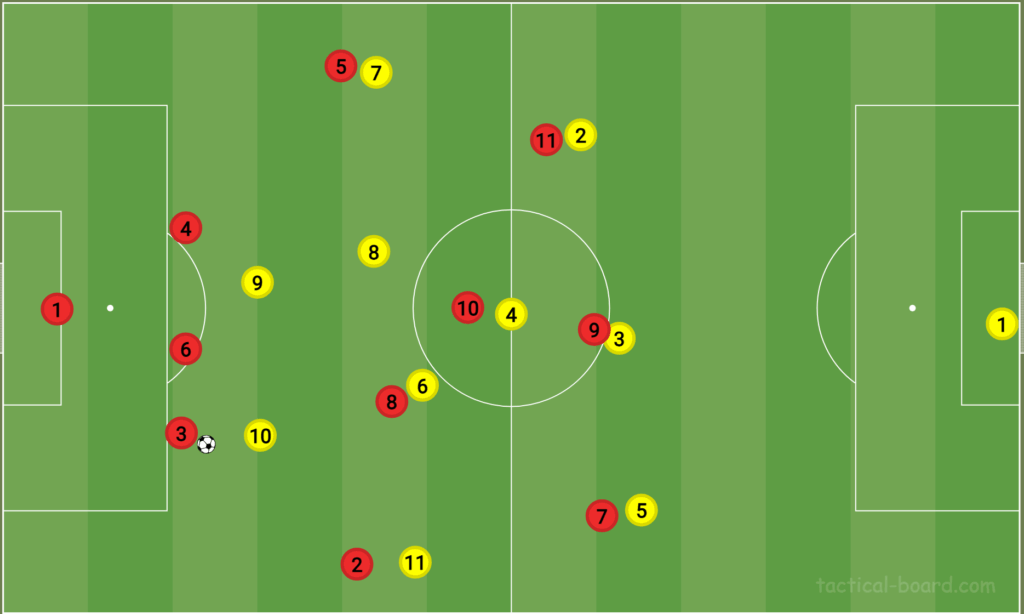 Dit terwijl ook een tactische oplossing mogelijk was geweest, bijvoorbeeld door een van de centrale middenvelders in de laatste linie te laten zakken om daar een overtal te creëren. Op die manier speel je een 3-tegen-2 uit, en indien de tegenstander ook dan doorstapt, kun je met beide overige middenvelders laag zorgen dat er ruimte ontstaat voor de drie voorwaartsen.