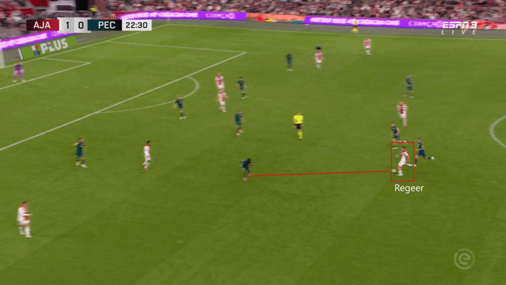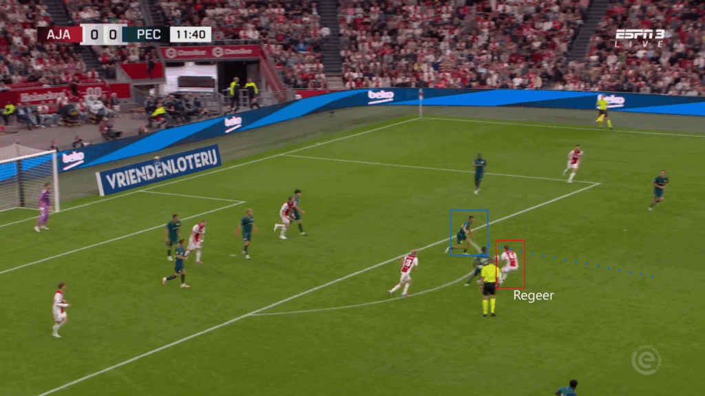Na in eerdere wedstrijden (inclusief voorbereiding) al Klaassen, Mokio en Fitz-Jim als nummer 6 gezien te hebben, was het vandaag de beurt aan Regeer. Hoewel Regeer tijdens de voorbereiding nog een groot gedeelte als rechtsback speelde, was het deze wedstrijd hij die belast was met de taak van controlerende middenvelder. Regeer vulde dat in zoals je van hem kon verwachten: in zijn loopacties en positionering is hij zeer sterk. Zo zag je hem geregeld tijdens de opbouw de juiste passlijnen vrijtrekken doordat hij een loopactie inzette, of herkende hij de juiste momenten om juist zelf aanspeelbaar te worden. Hierin excelleert hij echt, en is hij van meerwaarde doordat hij andere spelers meer in hun kracht laat spelen. Hij had daardoor ook een grote bijdrage in de over het algemeen soepele opbouw van Ajax. Zijn positionering kan Ajax zeker in dit soort wedstrijden helpen, mits hij wordt gekoppeld aan goede opbouwers rondom hem, zoals Itakura en Baas. Beide centrale verdedigers speelden een zeer sterke wedstrijd aan de bal, en dat was ook voor een aanzienlijk deel te danken aan Regeer.