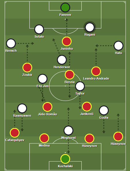 Wat ook opvalt, is dat beide backs regelmatig de ruimte krijgen om op te stomen naar voren, vaak zonder overleg. Hierdoor ontstaat er bij de omschakeling gemakkelijk ruimte voor Ajax. Deze ploeg, in tegenstelling tot teams als Slavia Praag en FC Groningen, leunt vooral op de individuele kwaliteit van de spelers. Er spelen een aantal behoorlijk getalenteerde spelers die het om verschillende redenen niet hebben gered in de topcompetities. Voor de kenners onder ons: dit zijn onder andere Benzia en Juninho. Vooral Juninho valt op met indrukwekkende cijfers, want sinds zijn komst in de zomer van 2023 heeft hij al 40 doelpunten gemaakt, waarvan 13 in Europa.
