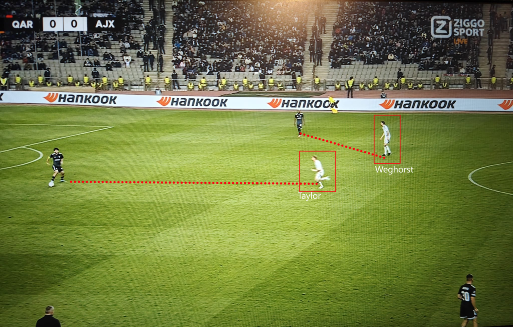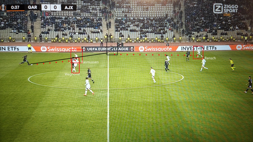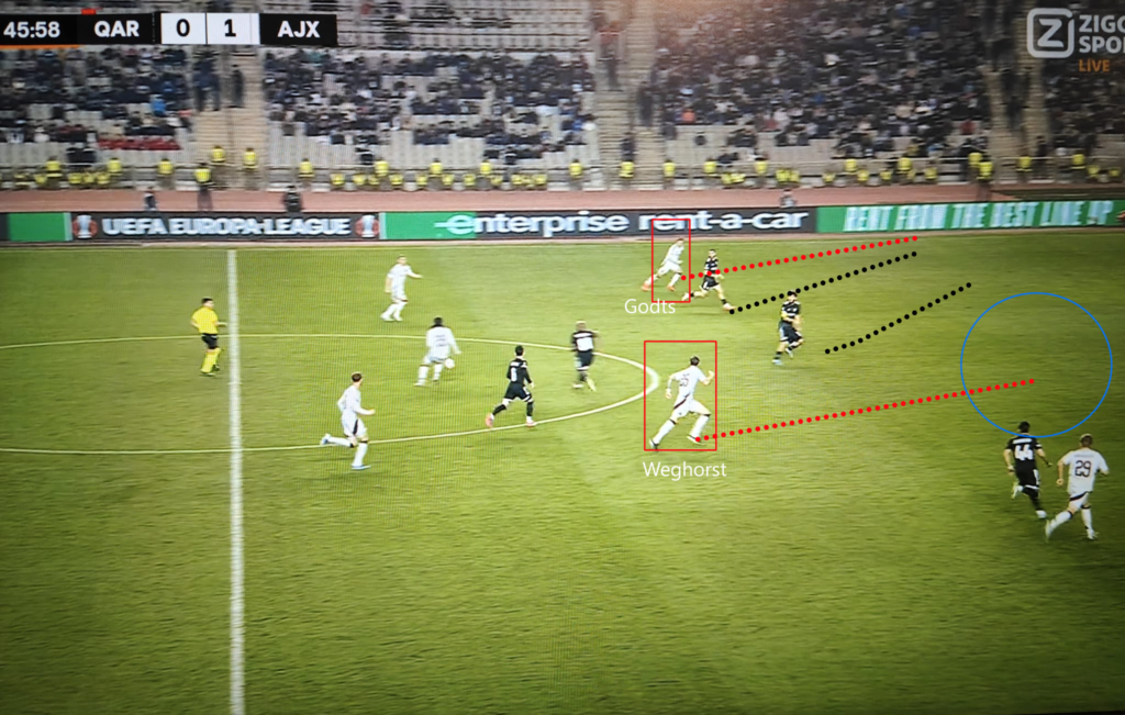 Bij momenten van onachtzaamheid of een slechte aanname kiest spits Juninho er soms voor om onverwacht druk te zetten, en hij doet dit altijd met volle overgave. Ondanks dat Qarabag de ruimtes klein maakt, heeft het twee belangrijke zwaktes: diepgang vanuit het middenveld bij voorzetten vanaf de andere kant. Bijvoorbeeld een voorzet vanaf de linkerkant, waarbij de rechter nummer 10 van Ajax diep loopt. Daarnaast is de afstemming en oriëntatie tussen de centrale middenvelders en de centrale verdedigers beperkt, dus diepgang op onverwachte momenten is een recept voor succes in deze wedstrijd.