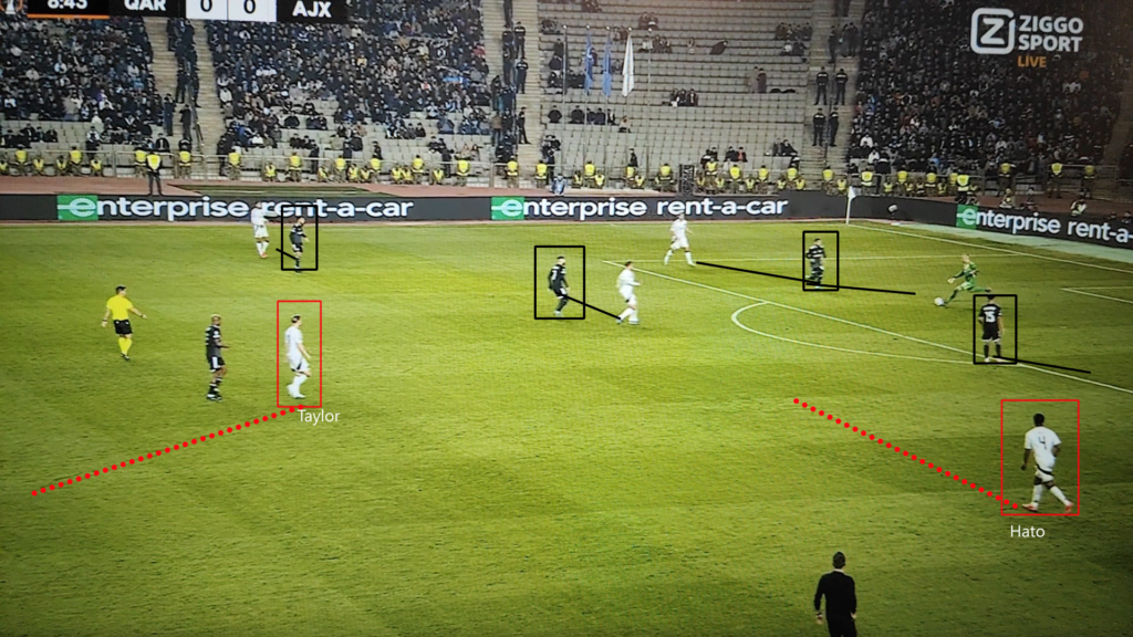 Daarnaast blijft het een keuze van Farioli om de eerste pass van de tegenstander kort toe te staan, zodat er daarna druk gezet kan worden. Het nadeel hiervan is dat Qarabag hierdoor in eerste instantie wel ruimte krijgt, en de ploeg beschikt over enkele individueel vaardige spelers. Een kleine kanttekening is dat dankzij deze tactiek de 1-0 tot stand kwam, want in zo’n situatie veroverde Taylor de bal. Al met al was het druk zetten van Ajax echter ver onder de maat.