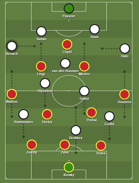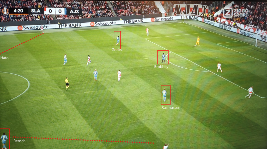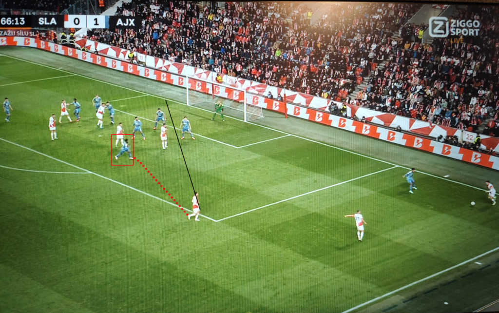 Tegelijkertijd zakte Van den Boomen vaak ver terug en fungeerde hij in veel situaties min of meer als centrale verdediger. Na de switch van Slavia Praag naar het 4-2-3-1-systeem veranderde Ajax hier weinig aan, behalve dat Hato nu standaard naar voren doordekte en Rensch bij zijn directe tegenstander bleef.