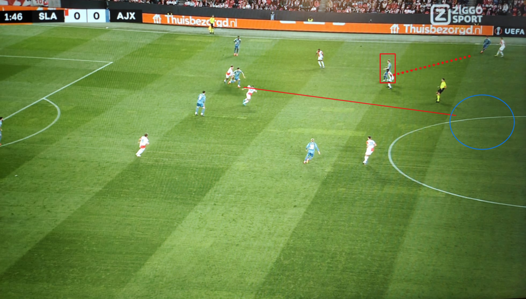 Ook aanvallend veranderde er het nodige bij Slavia Praag gedurende de wedstrijd. Waar het in eerste instantie ‘gewoon’ speelde vanuit een 3-4-2-1-systeem, schakelde het rond de 30e minuut ook aanvallend over naar een 4-2-3-1-systeem. Dit beïnvloedde het strijdplan van Ajax overigens nauwelijks. Ajax koos ervoor om met de vleugelaanvallers druk te zetten op de centrale verdedigers van Slavia Praag. De backs van Ajax zetten druk op de wingbacks van Slavia Praag door half te positioneren. Dit betekent dat ze klaarstaan om druk te zetten zodra de bal naar hun kant gaat, maar terugzakken naar hun gebruikelijke positie als de bal niet die kant op wordt gespeeld.