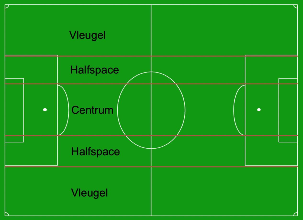 Aanvallend gezien speelt Slavia Praag in hetzelfde 3-4-2-1-systeem, een formatie die ik eerder heb omschreven als de ultieme veldbezetting. Dit heeft te maken met de verdeling van het veld in vijf vakken over de breedte. In de afbeelding hieronder is dit weergegeven. De wingbacks van Slavia Praag zijn verantwoordelijk voor het behouden van de breedte, waardoor de tegenstander wordt opgerekt, terwijl de aanvallende middenvelders in de gevaarlijkste zone van het veld terechtkomen: de halfspace. Het grote voordeel van de halfspace is dat er minder druk is dan in het centrum, maar het ligt dicht genoeg bij het midden om veel kansen te creëren vanuit die positie.