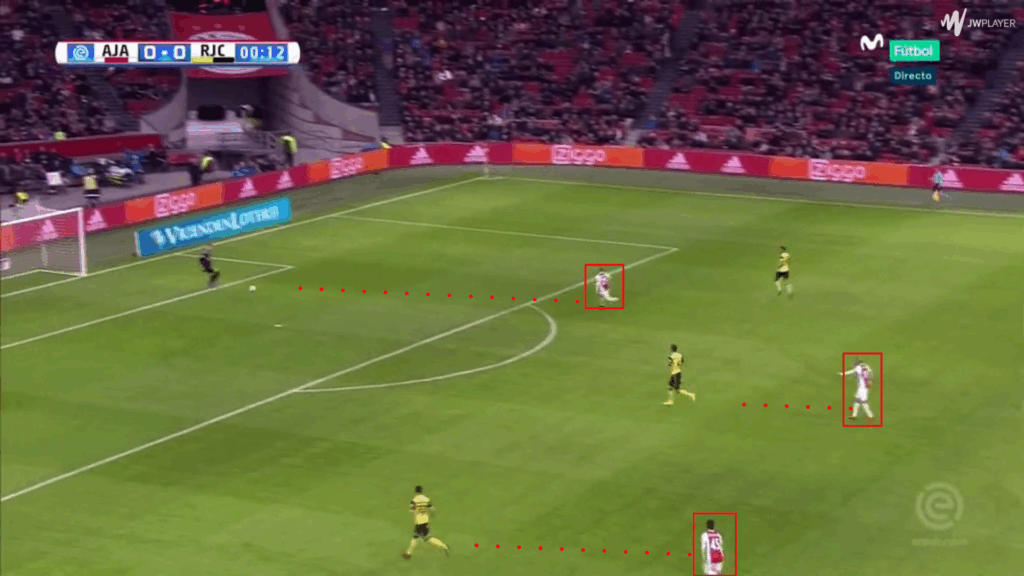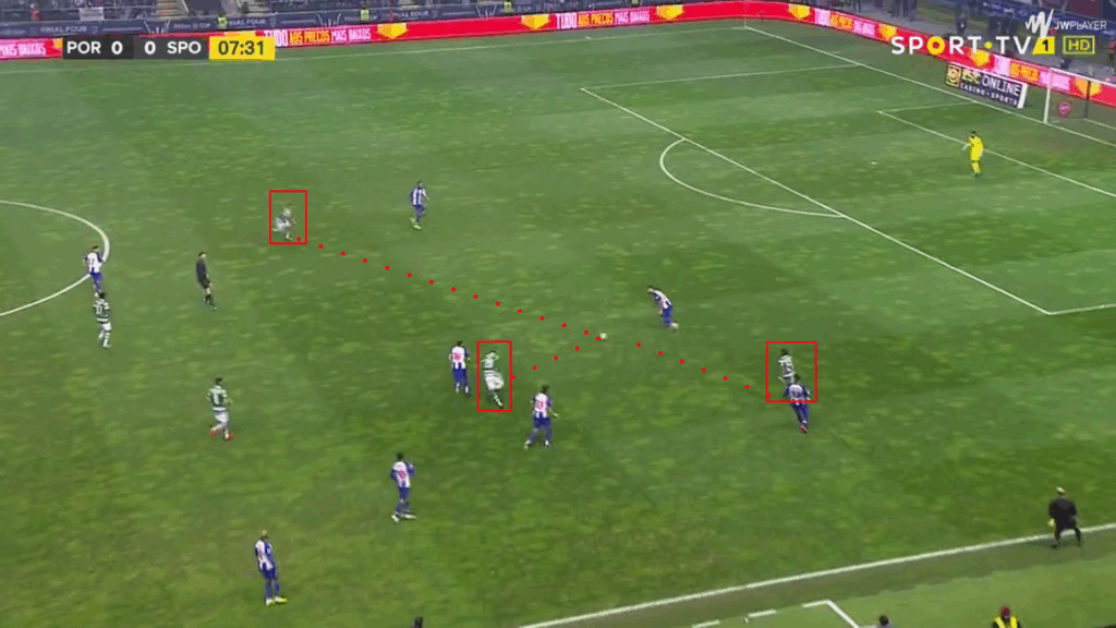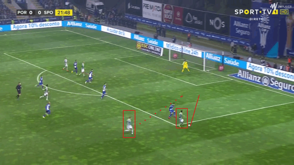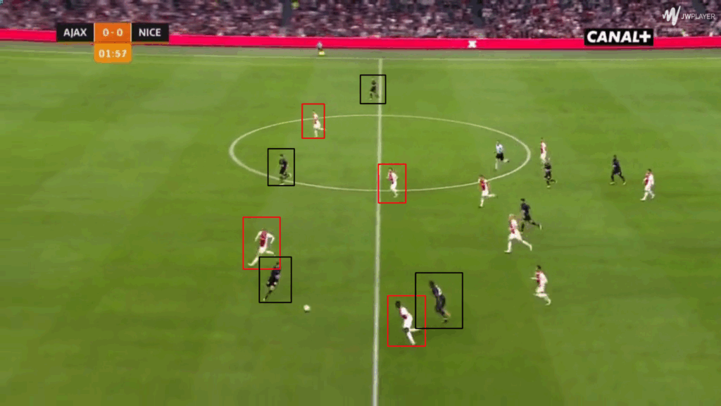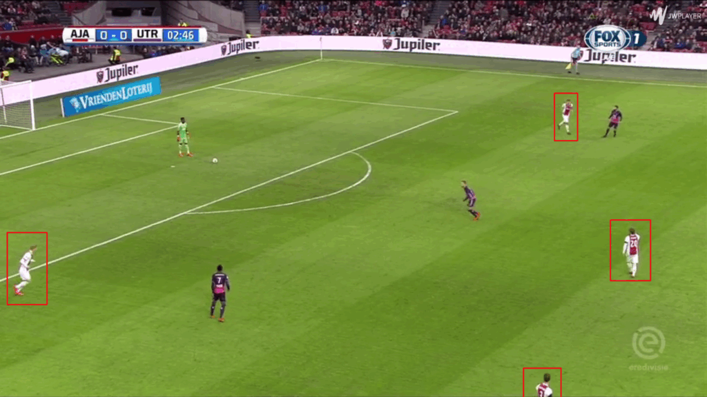 Als we verder kijken naar het aanvalsspel, zien we een ander belangrijk patroon terugkeren: het minimaal bezetten van de flank met als doel een overtal in het centrum te creëren. In vrijwel alle situaties zag je bij zowel Ajax als Sporting dat de vleugel maar door één speler werd bezet, waarbij dit afwisselend de buitenspeler of de back was. Bij Ajax zag je in de fases dat Veltman als rechtsback speelde, dat hij veelal de zijkant opzocht, waardoor Neres of Kluivert de ruimte kreeg om te zwerven, terwijl je aan de andere kant zelfs toen al geregeld backs aan de binnenkant zag opduiken. Maar dit wisselde per wedstrijd; soms was het omgekeerd. Dit gebeurde langzamerhand minder vaak toen De Jong vaker als extra middenvelder kwam te spelen en als Sinkgraven linksback was, dan speelde die vaak in de buitenbaan en Veltman aan de binnenkant. Wat ook opvalt daarin is dat je de underlap ook in die tijd al terug zag, wat bijzonder vooruitstrevend was. Toch zag je dezelfde patronen ook bij Sporting, waarbij bijvoorbeeld Raphinha (nu Barcelona) aan de binnenkant speelde en rechtsback Gaspar de buitenkant hield, terwijl het dan op de andere flank omgekeerd gebeurde. Alles met als doel om de flank minimaal te bezetten, om zo een tegenstander wel op te rekken, maar vooral centraal een overtal aan spelers te creëren. Het was altijd duidelijk zichtbaar dat bij al zijn ploegen maximaal één back tegelijkertijd een rol mocht spelen in het aanvalsspel, terwijl de andere back zich vooral moest richten op het vormgeven van de opbouw.