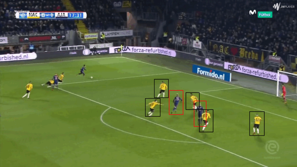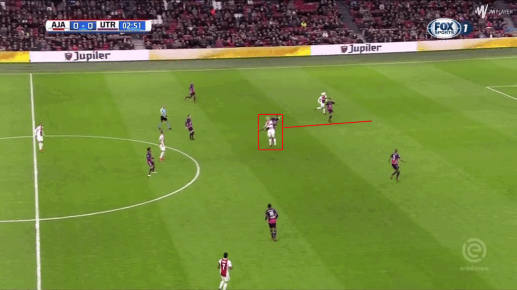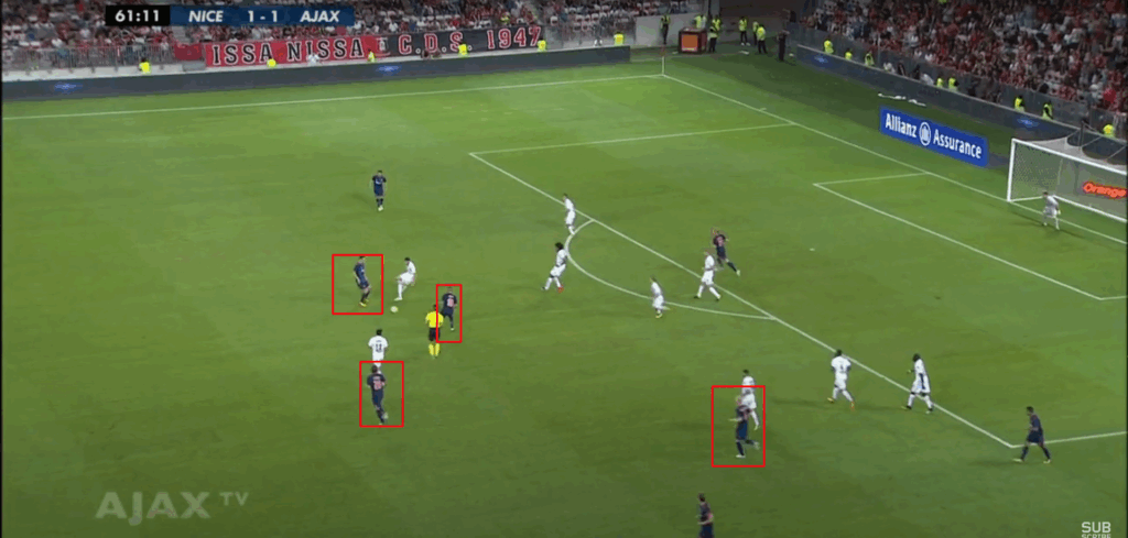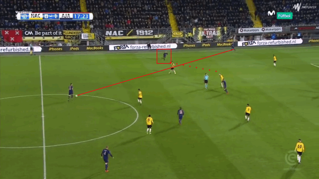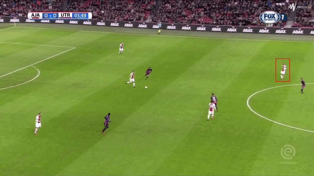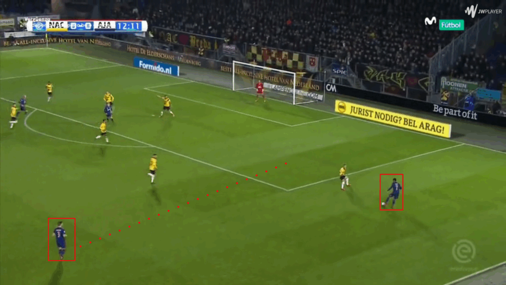 Als we verder kijken naar het aanvalsspel, zien we een ander belangrijk patroon terugkeren: het minimaal bezetten van de flank met als doel een overtal in het centrum te creëren. In vrijwel alle situaties zag je bij zowel Ajax als Sporting dat de vleugel maar door één speler werd bezet, waarbij dit afwisselend de buitenspeler of de back was. Bij Ajax zag je in de fases dat Veltman als rechtsback speelde, dat hij veelal de zijkant opzocht, waardoor Neres of Kluivert de ruimte kreeg om te zwerven, terwijl je aan de andere kant zelfs toen al geregeld backs aan de binnenkant zag opduiken. Maar dit wisselde per wedstrijd; soms was het omgekeerd. Dit gebeurde langzamerhand minder vaak toen De Jong vaker als extra middenvelder kwam te spelen en als Sinkgraven linksback was, dan speelde die vaak in de buitenbaan en Veltman aan de binnenkant. Wat ook opvalt daarin is dat je de underlap ook in die tijd al terug zag, wat bijzonder vooruitstrevend was. Toch zag je dezelfde patronen ook bij Sporting, waarbij bijvoorbeeld Raphinha (nu Barcelona) aan de binnenkant speelde en rechtsback Gaspar de buitenkant hield, terwijl het dan op de andere flank omgekeerd gebeurde. Alles met als doel om de flank minimaal te bezetten, om zo een tegenstander wel op te rekken, maar vooral centraal een overtal aan spelers te creëren. Het was altijd duidelijk zichtbaar dat bij al zijn ploegen maximaal één back tegelijkertijd een rol mocht spelen in het aanvalsspel, terwijl de andere back zich vooral moest richten op het vormgeven van de opbouw.