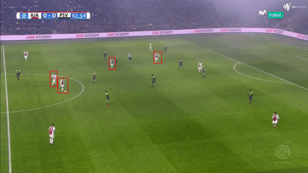 Zodra de eerste druk is omzeild, zien we het volgende patroon ontstaan: het inschuiven van één van de verdedigers als middenvelder. Het meest in het oog springende voorbeeld hiervan was Frenkie de Jong, die als centrale verdediger werd geposteerd door Keizer en veelvuldig al vroegtijdig doorschoof naar het middenveld nadat de eerste druk was omzeild, waaronder in de wedstrijd tegen PSV. Het doel hiervan is om twee linies van twee middenvelders te creëren, ook wel een box of vierkant genoemd. Iets wat in het hedendaagse voetbal niet heel vernieuwend is, maar toentertijd behoorlijk vooruitstrevend was.