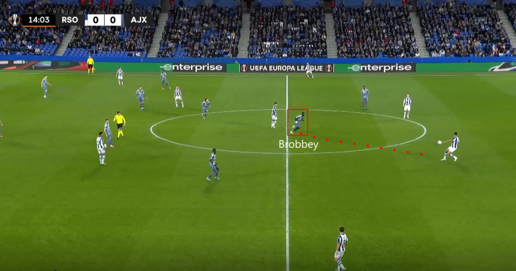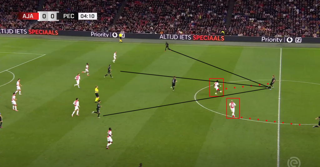 Hier is duidelijk te zien dat Brobbey vanuit de passlijn naar de controleur doorstapt in de richting van de centrale verdediger. Dit zorgt er voor dat de controleur in ieder geval niet direct aangespeelt kan worden, en ze vandaaruit verder kunnen voetballen.