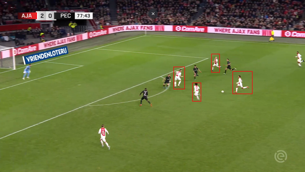 4 spelers van Ajax staan binnen 10 bij 10 meter van elkaar, dan wordt het erg lastig om door een verdediging heen te komen. Het gebeurd te vaak dat spelers van Ajax op één lijn staan qua hoogte, waardoor je een tegenstander het makkelijk maakt, je maakt namelijk de ruimtes klein.