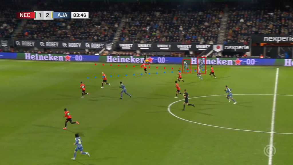 Gaaei kiest er in deze situatie voor om de rode lijn te volgen, maar dat is precies dezelfde lijn die Traoré al loopt, die de bal heeft. Als hij de blauwe lijn volgt dwingt hij NEC tot keuzes maken, en geeft hij daarmee óf Traoré meer ruimte, of komt hij zelf vrij te staan.