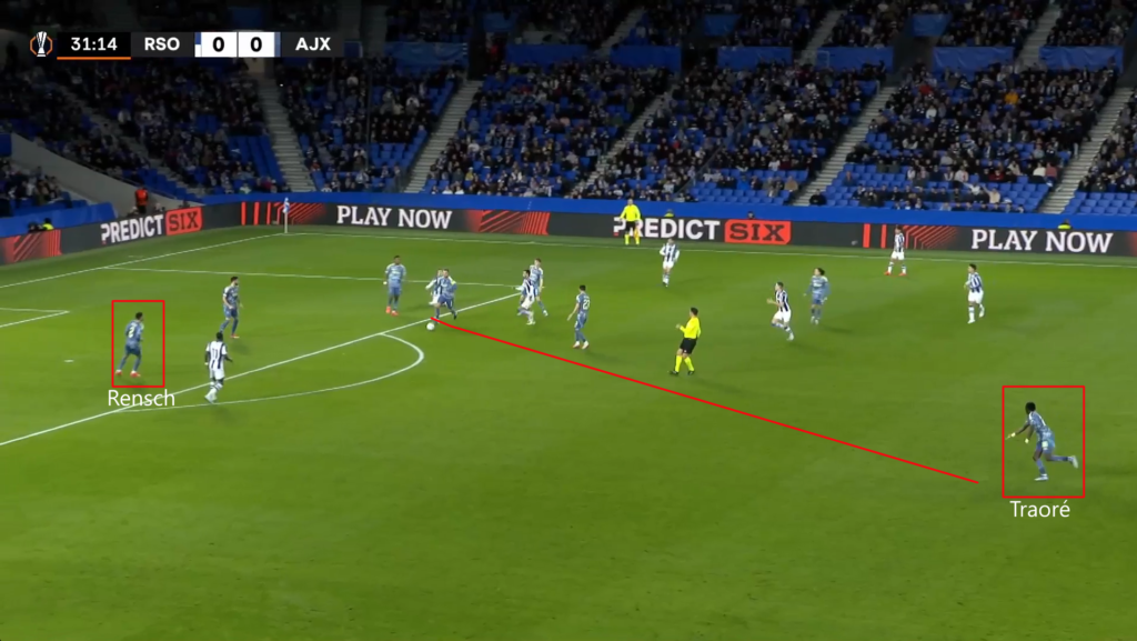 In dit geval is Rensch naar het centrum toe getrokken, en achteruit gestapt, wat de passlijn richting Traoré opentrekt voor Henderson.