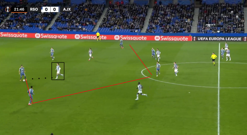 Šutalo wacht hier net zo lang tot de speler van Sociedad uitgestapt is, en dan kan er binnen drie passes de andere kant van het veld bereikt worden. Wacht hij niet, staan zowel Rensch als Berghuis direct onder druk van twee kanten, waardoor deze ruimtes er niet getrokken worden.
