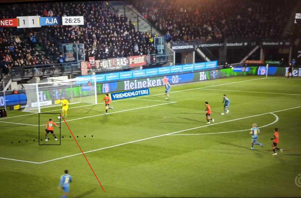 Pasveer wacht hier net zolang, tot de speler van NEC er voor kiest om de passlijn naar Sutalo (buiten beeld) af te schermen, in plaats van de passlijn naar Rensch. Waardoor hij weet dat Rensch aanspeelbaar is en vrij kan komen.
