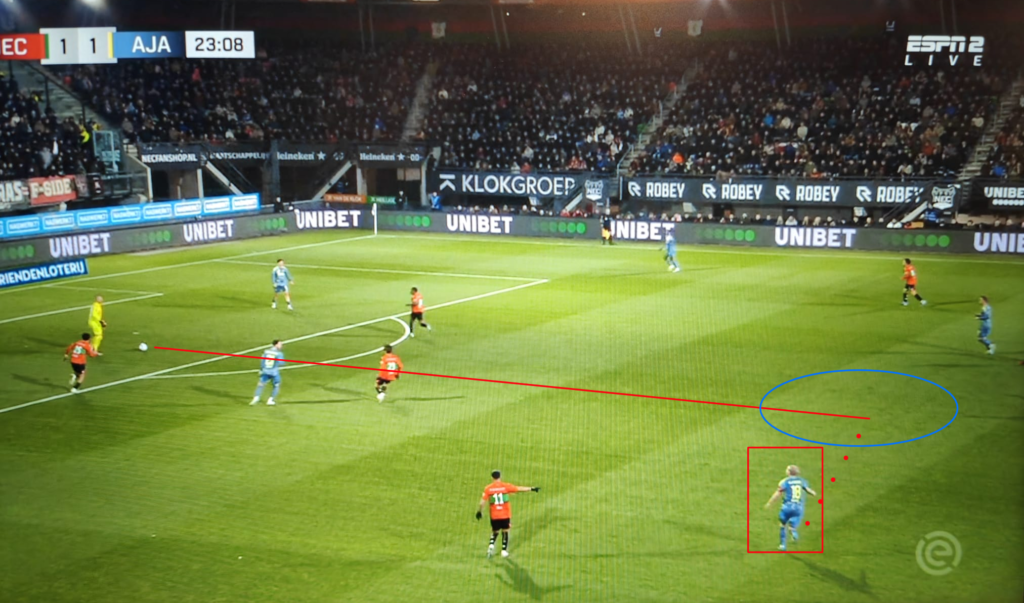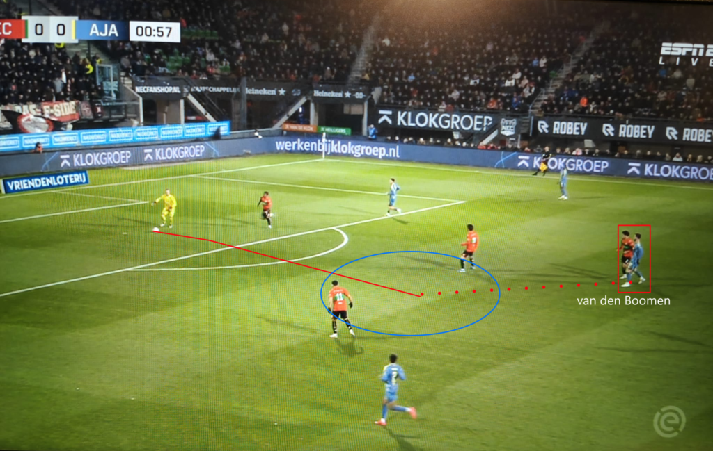 Door zijn lage handelingssnelheid speelt hij hier niet Sutalo in, maar moet hij hem noodgedwongen terug spelen. Hierdoor komt Ajax niet onder de druk uit, en moeten ze weer opnieuw beginnen.