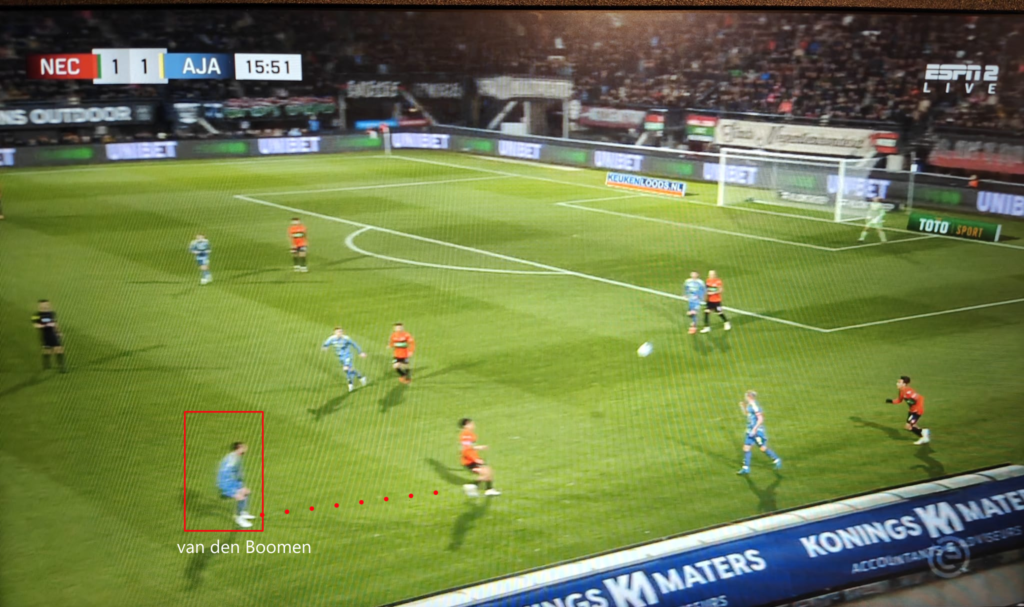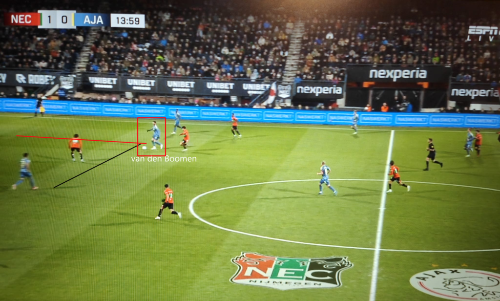 Toch was dit niet eens het grootste probleem. Het grootste probleem was zijn onvermogen om te herkennen welke ruimtes hij in moest bewegen en wanneer hij wel of niet in de bal moest komen om een overtal te creëren. NEC drukte door met drie spitsen, wat voor Van den Boomen de taak was om via een korte kaats de backs te bereiken die vrij kwamen. Hij was echter steevast te laat met zijn loopacties en had moeite om deze drukmomenten van NEC uit te spelen. Dit bemoeilijkte de opbouw van Ajax enorm. Eigenlijk waren de enige momenten waarin de opbouw wél slaagde, te danken aan lange ballen of een snelle voortzetting vanuit de verdediging.