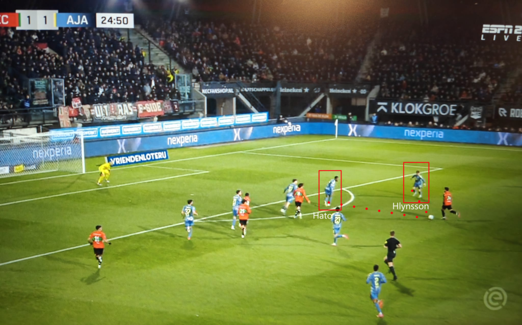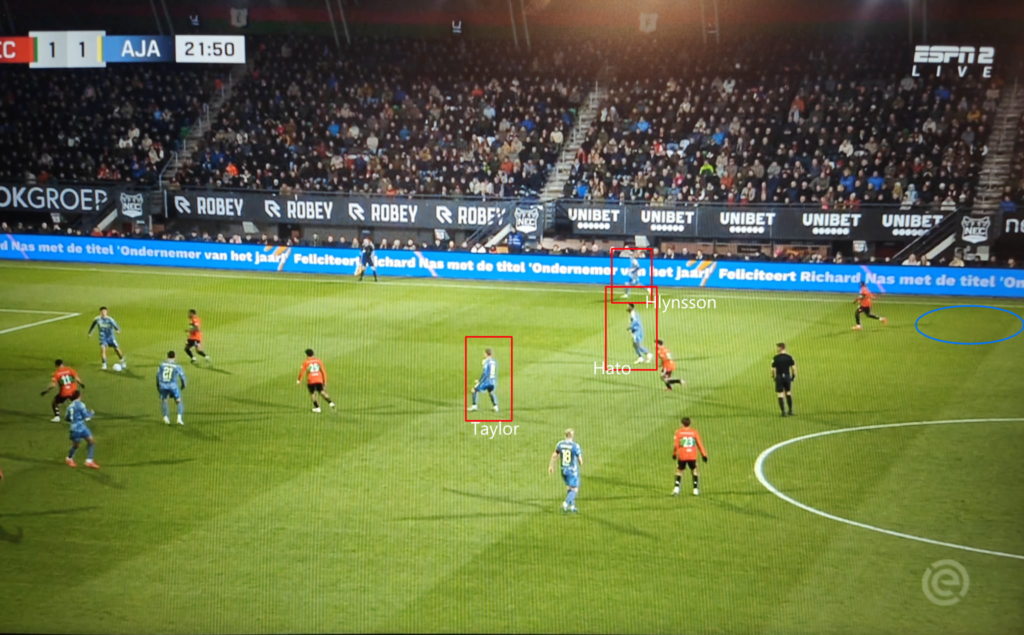 Hlynsson was op voorhand niet de meest logische keuze om te laten starten als linksbuiten, maar er zat zeker een gedachte achter. Hlynsson en Taylor moesten samen de ruimte achter Proper (rechtermiddenvelder) en Pereira (rechtsback) aanvallen. Pereira is een soms wat wilde back, die geregeld onnodig uitstapt, terwijl Proper geen natuurlijke verdedigende middenvelder is en moeite heeft om de ruimtes verdedigend te sluiten. Het was daarom aan Ajax om van deze zwakke punten gebruik te maken via het duo.
