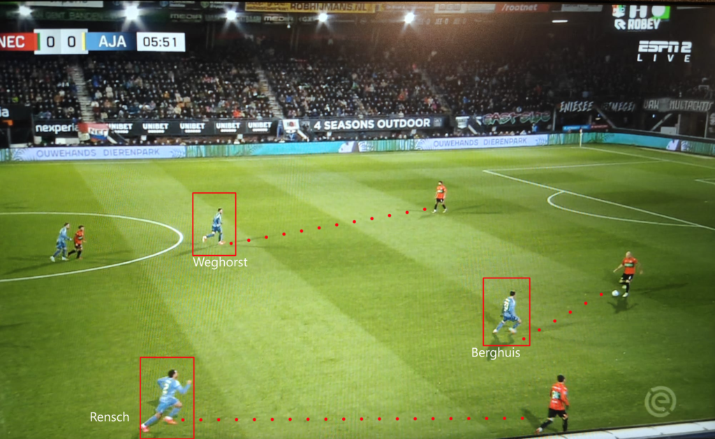 Daarnaast maakte Farioli zelf een inschattingsfout. NEC speelde met een rechtsback die ver naar voren stond en een linksback die achterin bleef. Toch probeerde Ajax aanvankelijk vanuit Berghuis druk te zetten, terwijl Rensch moest doorstappen richting de linksback van NEC. Het probleem was echter dat de afstand die Rensch moest overbruggen te groot was, waardoor ook Sutalo in grote ruimtes terechtkwam. Dit werd nog verergerd doordat Sutalo niet de gebruikelijke ondersteuning van Henderson kreeg, wat zorgde voor defensieve chaos bij Ajax.