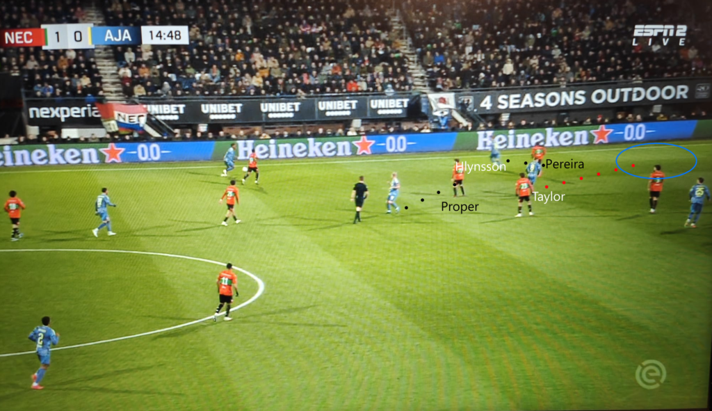 HIer vergeet Hlynsson Pereira te ‘binden’, als hij dieper gaat staan, creëert hij ruimte voor Hato en Taylor om daar de twee tegen één uit te spelen. Nu zijn de ruimtes daarvoor te klein, en is het druk zetten makkelijker voor NEC.