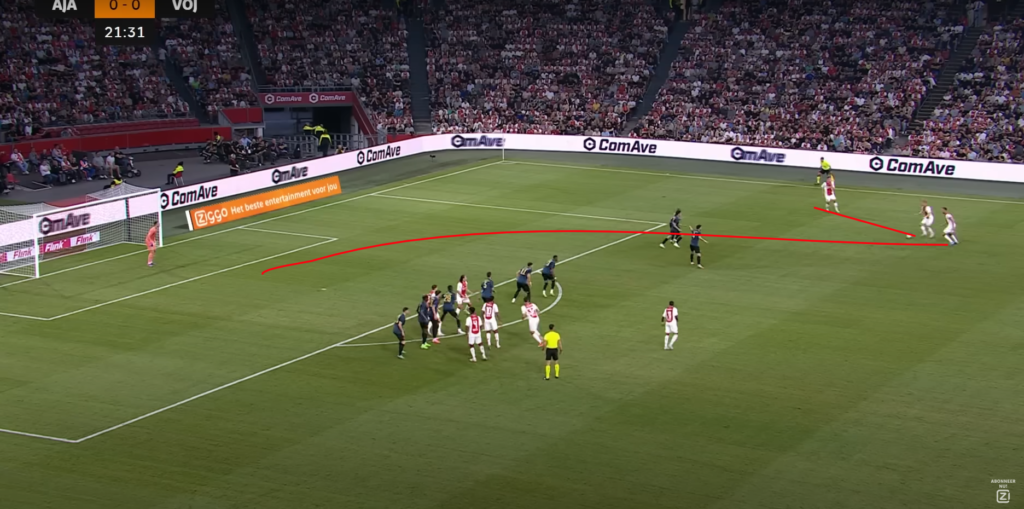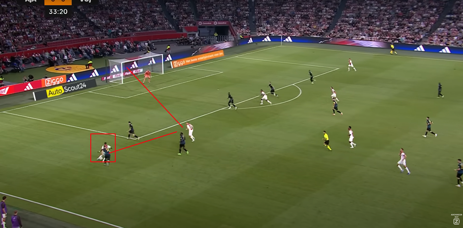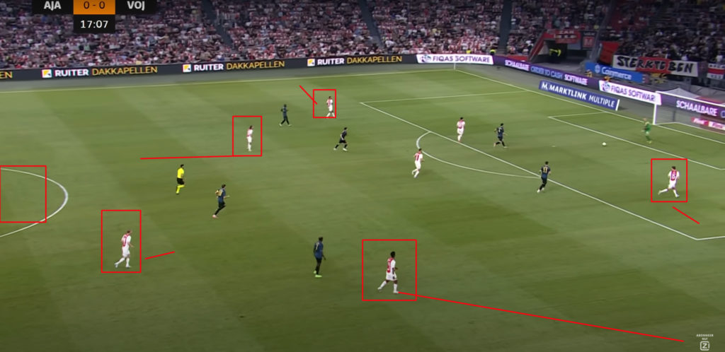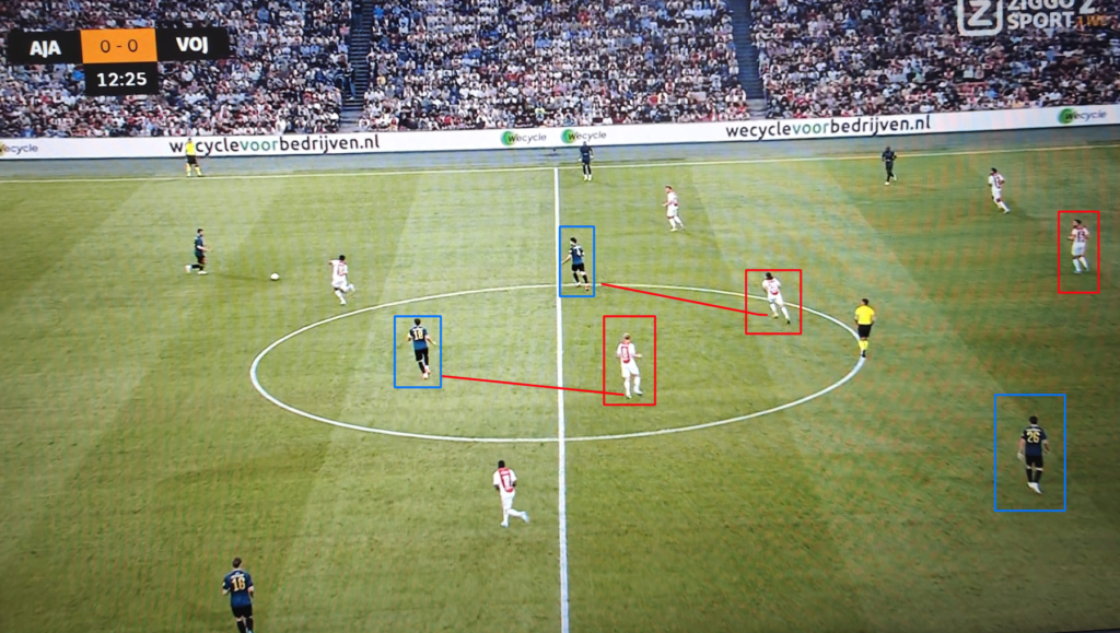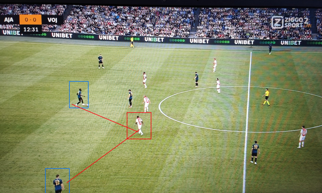 Het is duidelijk te zien dat Vojvodina aandacht had besteed aan hoe Ajax druk zet en hoe hier mee om te gaan. Ook hier verraste Vojvodina enigszins door regelmatig voor de korte opbouw te kiezen, iets wat niet het handelsmerk is van de Servische club. Maar door twee slimme zetten was Ajax bij vlagen het spoor bijster en kreeg het maar moeizaam druk vooruit op de helft van de tegenstander. Vojvodina koos er in eerste instantie voor om de rechtsback heel laag in de opbouw te positioneren en tegelijkertijd de rechtsbuiten heel ver naar voren te plaatsen. Dit zorgde ervoor dat Hato moeilijk door kon stappen en dat Forbs dus op twee spelers tegelijkertijd druk moest zetten. In het onderstaande voorbeeld zie je waar het probleem voor Forbs zich voordoet.