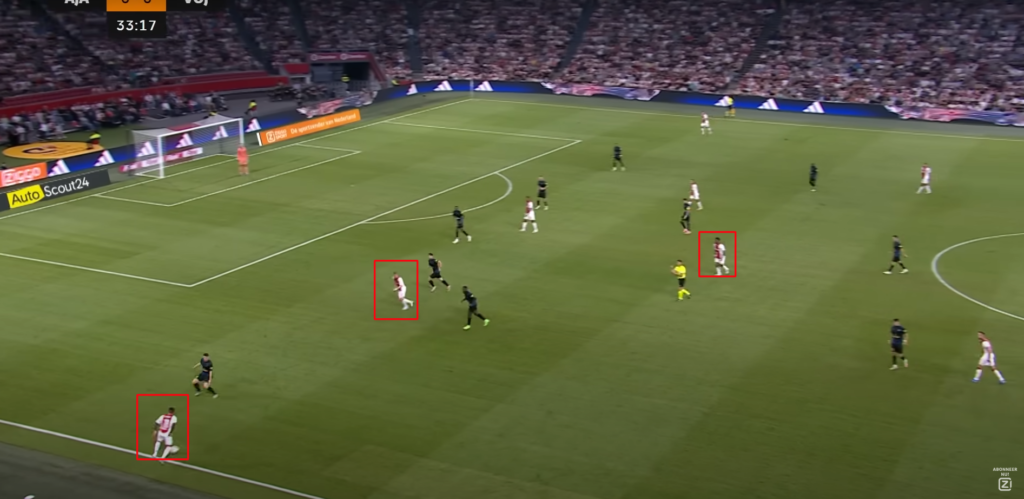 Om over te gaan naar de positieve punten, moeten we eerst kijken naar de dynamiek op de linkerflank. Het trio Hato, Taylor en Forbs bleek behoorlijk complementair en creëerde vooral in het kwartier voor rust het nodige gevaar. Taylor zocht vaak de diepte, waardoor Forbs in een 1-op-1 situatie vrij kwam. Hato kon vervolgens snel Forbs bereiken en zijn directe tegenstander wegtrekken door naar het middenveld te schuiven. Onderstaande afbeelding is typerend voor de situatie wanneer Ajax balbezit had op de helft van Vojvodina. Forbs stond aan de buitenkant, Taylor in de halfspace en Hato fungeerde als spelverdeler daarachter.