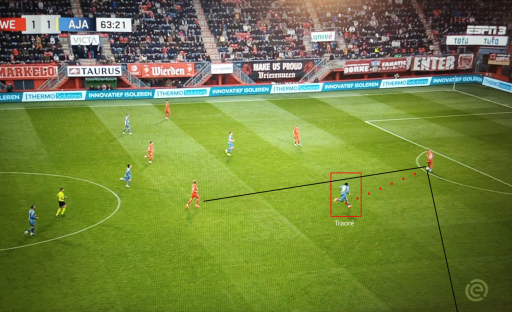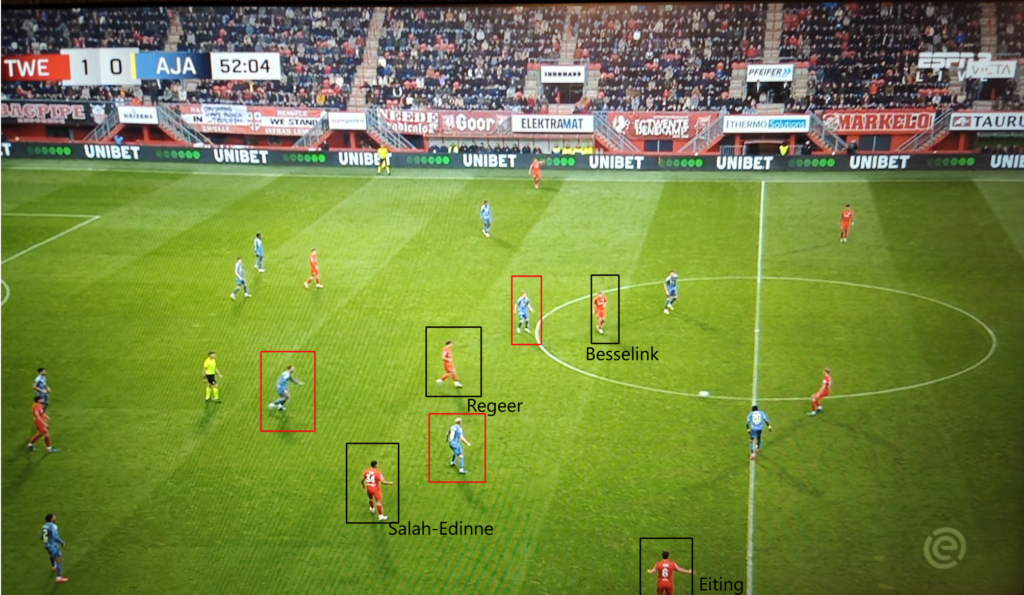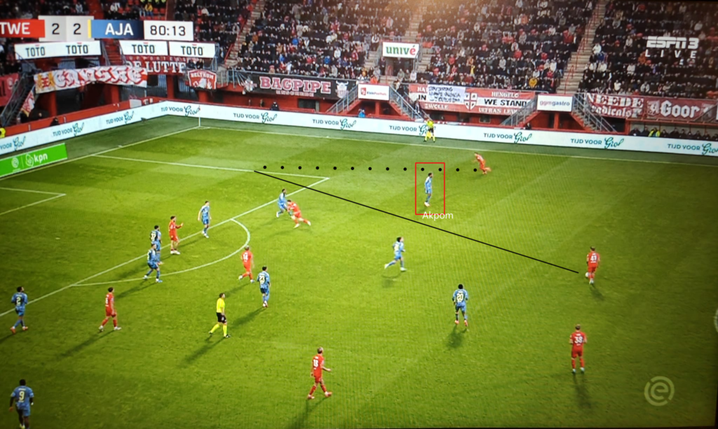 Waar Godts in de eerste helft met perfecte discipline Van Rooij uit de wedstrijd hield en Akpom ervoor zorgde dat Salah-Edinne maar mondjesmaat aan de bal kon komen, veranderde dit compleet na het uitvallen van Godts, ondanks dat het plan in principe ongewijzigd bleef. Hoe kan dit? Het antwoord ligt in het feit dat Traoré niet in staat was dezelfde looplijnen dicht te lopen en niet slim genoeg was om op de juiste momenten wel of niet door te stappen, iets waar Akpom veel beter in is. Aan de andere kant verzuimde Akpom te vaak om mee te lopen met Van Rooij. Door deze twee factoren kon Ajax nauwelijks druk uitoefenen op de achterhoede, waardoor Twente redelijk vrij kon opbouwen. Opvallend genoeg kwam Unnerstall, een fantastische lijnkeeper, voetballend nauwelijks in de problemen, ondanks dat zijn voetenwerk niet zijn sterkste punt is. Vooral Salah-Edinne profiteerde keer op keer van het gebrek aan slimme loopacties van Traoré, waardoor het middenveld kon worden ingespeeld en Ajax daar in de problemen kwam.