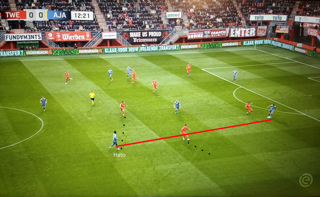 Oosting had duidelijk de wedstrijden van Ajax tegen PSV en Feyenoord goed bestudeerd. Hij koos ervoor om bij de opbouw van Ajax niet man-op-man door te dekken, maar meer de ruimtes te verdedigen. Tegelijkertijd schoof Bessellink regelmatig terug naar de laatste linie, waardoor Twente een 5-4-1-formatie vormde. Na een wat moeizame openingsfase vond Ajax via Hato het antwoord: hij maakte goed gebruik van de ruimte in de rug van Rots. Rots had bij vlagen moeite om zijn man te volgen en de passlijnen goed genoeg af te sluiten, waardoor Hato regelmatig vrij tussen de vier middenvelders van Twente kon komen. Dit leidde uiteindelijk ook tot de grote kans van Akpom, waarbij hij echter geen penalty verdiende. Het was duidelijk te zien dat Farioli zijn spelers hierop had voorbereid en dat ze wisten waar mogelijk ruimte kon ontstaan.