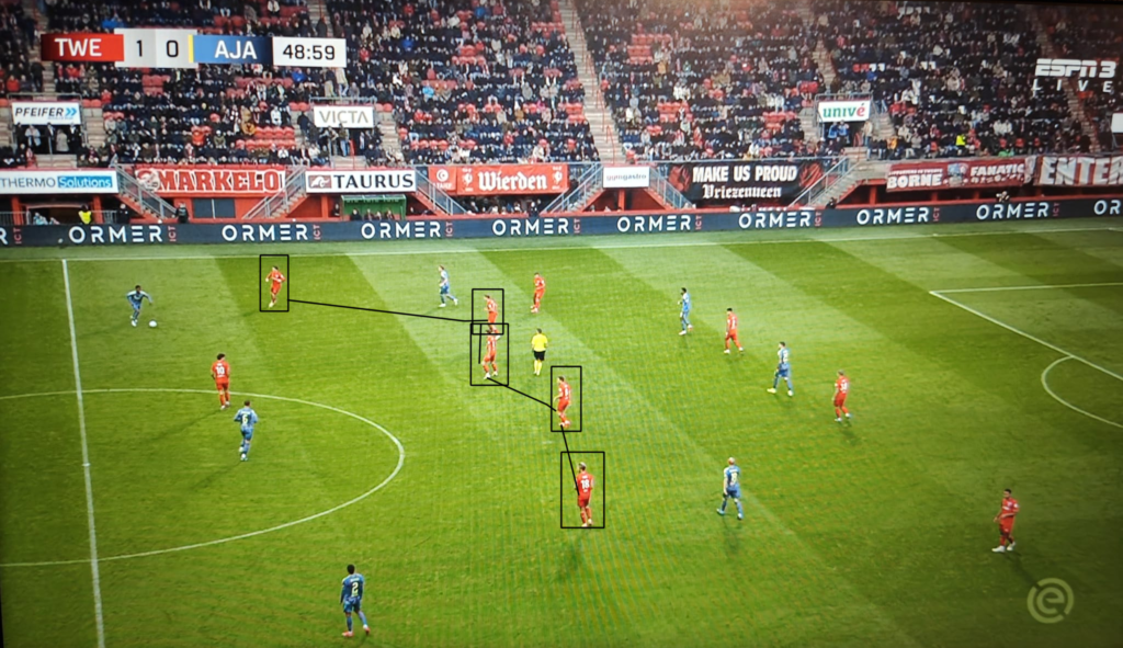 Na rust verloor Ajax ook deels de intensiteit op het middenveld. Oosting zette vanaf het begin van de wedstrijd in op continue positiewisselingen en bewegingen op het middenveld als sleutel om de druk van Ajax te ontregelen. Vooral door het inbrengen van Steijn en het terugschuiven van Regeer dwong Twente Ajax voortdurend tot lastige keuzes. De middenvelders van Ajax volgden hun man grotendeels, maar soms droegen ze hem over aan een ander, wat leidde tot te veel situaties waarin Twente gemakkelijk kon voetballen. Het leek erop dat de spelers van Ajax vermoeid raakten, en door deze overnames op het middenveld slaagde Ajax er niet meer in om druk op Twente uit te oefenen.