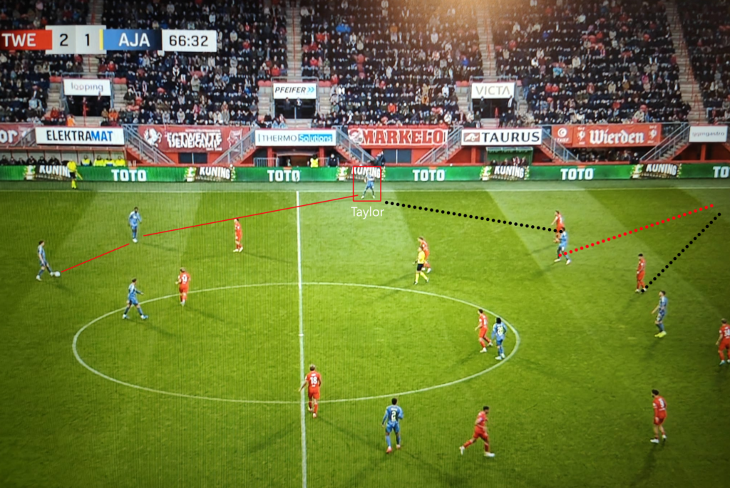 Er waren momenten waarop Ajax de eerste druk wist te omzeilen, en Taylor herkende dat er aan de linkerkant regelmatig kansen lagen. Bij de 1-1 ontbrak de afstemming tussen Besselink en Hilgers, waardoor hij vrij kon voorzetten. Ook bij de 2-2 moest Hilgers doorstappen richting Akpom, terwijl Besselink verzuimde om op volle intensiteit mee te lopen. Het was cruciaal dat Taylor wist hoe hij deze 4-5-1 kon omzeilen, namelijk door een ‘overload’ op de flank te creëren. Na zijn wissel brachten Fitz-Jim en Berghuis echter te weinig intensiteit om dit effectief uit te voeren, waardoor de wedstrijd langzaam doodbloedde. Toch was duidelijk dat de aanpassing van Oosting goed werkte en het Ajax na rust veel moeilijker maakte om te voetballen.