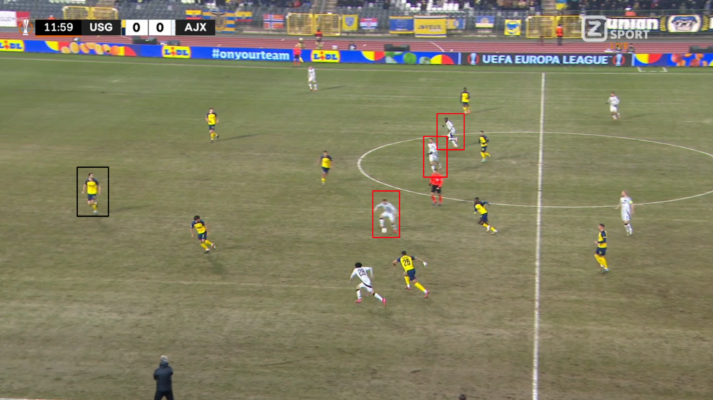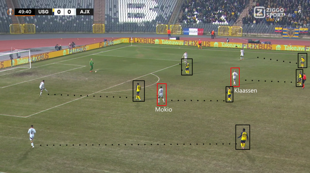 Waar na de winterstop al zichtbaar was dat een van de aanvallende middenvelders Henderson bij momenten ondersteunde, is Mokio’s startpositie nu vaak al naast Klaassen, in plaats van dat hij daarheen beweegt. Tegelijkertijd kan Hato soms inschuiven in het centrum als daar ruimte ligt, bijvoorbeeld wanneer zijn tegenstander niet meebeweegt. Op deze manier spiegelt Ajax grotendeels waar de ruimtes tegen Union liggen, iets wat Twente eerder dit seizoen al succesvol demonstreerde.