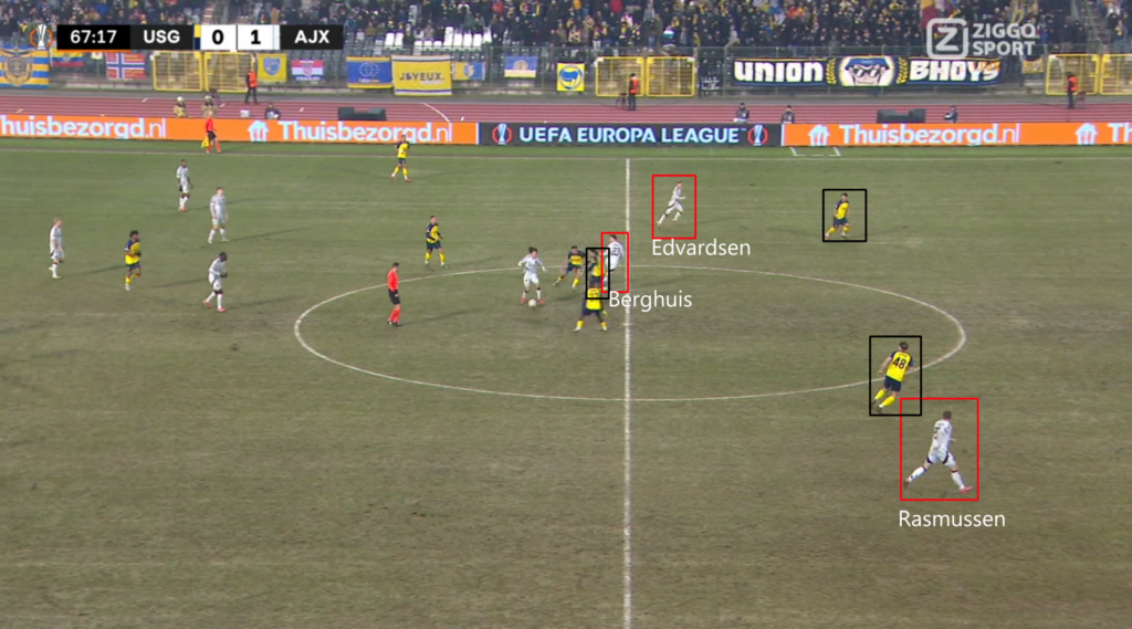 Daarnaast ontbreekt het bij langdurig balbezit op de helft van de tegenstander aan spelers in en rond de zestien die écht diep lopen vanuit het centrum. Rasmussen en Edvardsen proberen dit vanaf de zijkanten te compenseren, maar extra diepgang vanuit het centrum zou het spel op sommige momenten hebben vergemakkelijkt.