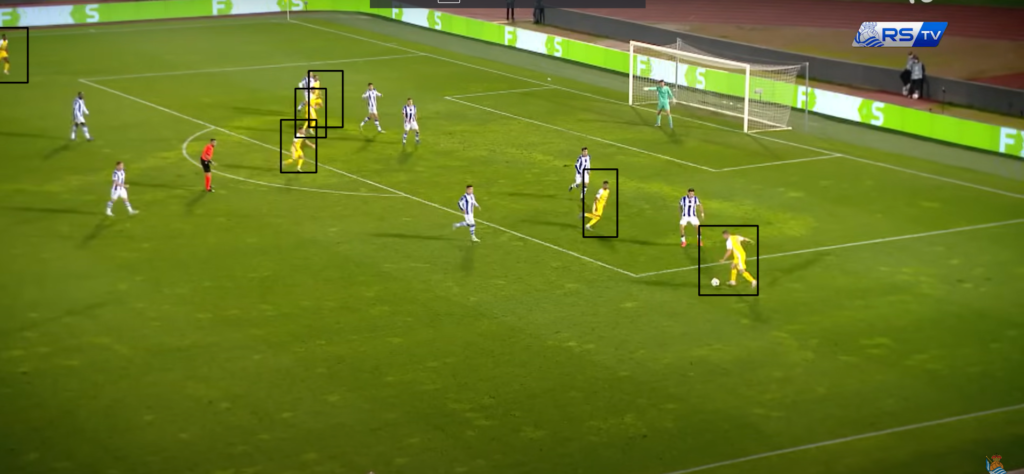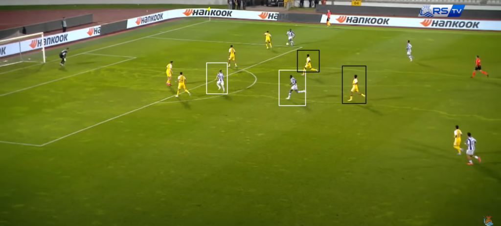 Een voorbeeld waarin Sissokho zowel de man niet dekt, als de passlijn niet afschermt, en Kanichowskiy te laat is, en zijn man dus de vrije doorloop krijgt. Ook hieruit valt een goal in de wedstrijd tegen Real Sociaded.