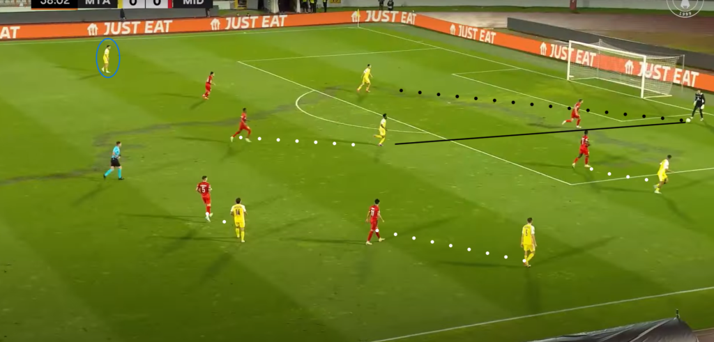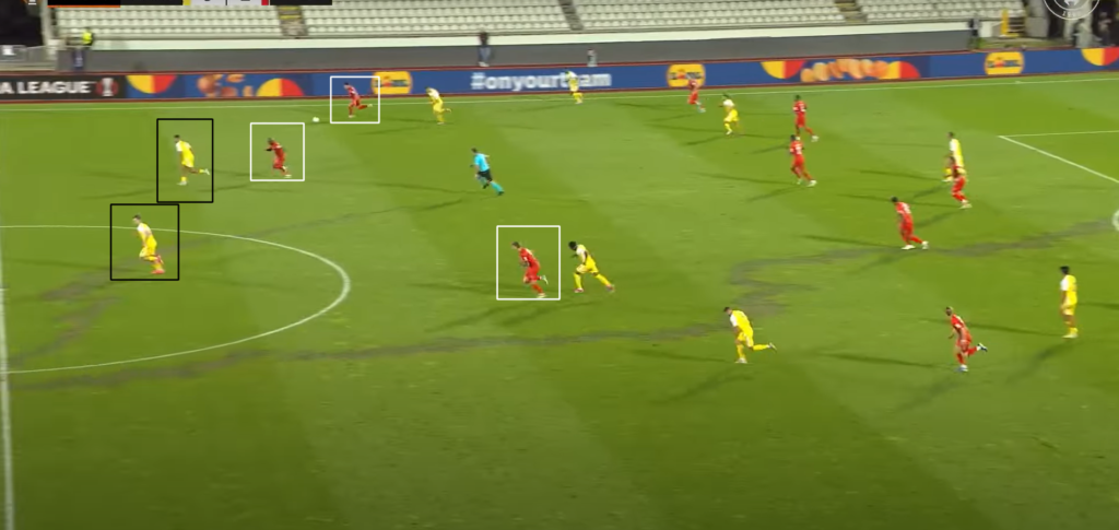 In deze situatie speelt de keeper de bal via de zwarte lijn, terwijl de rechter centrale verdediger vrij is, en meteen dan ook ruimte heeft om hem te openen naar de rechtsback. UIteindelijk is de pass van de keeper zelfs zo slecht dat hij niet aankomt, en Midtjylland het uitspeelt tot de 1-0.